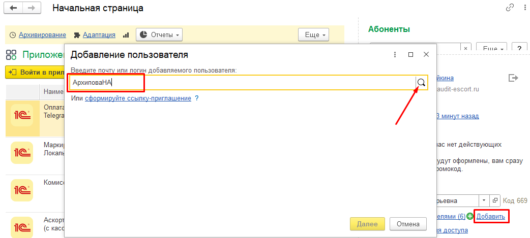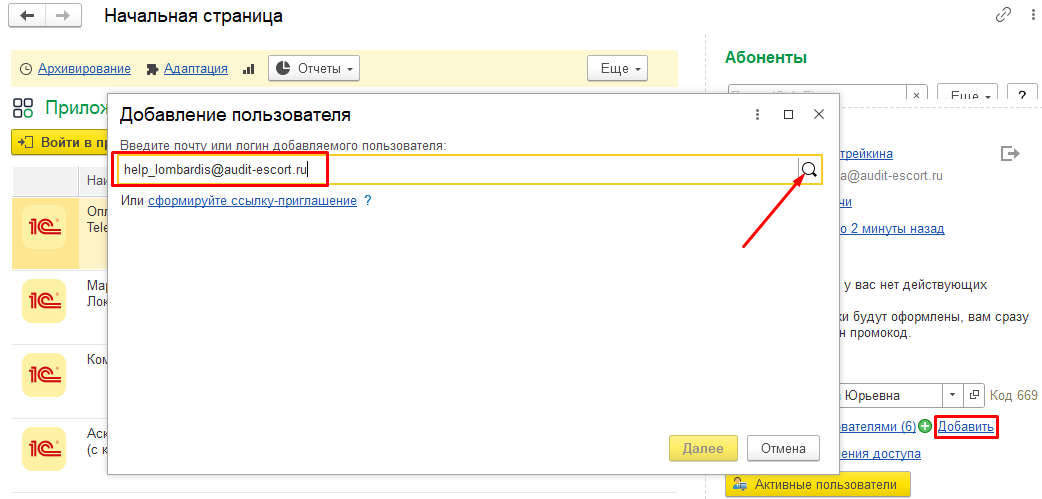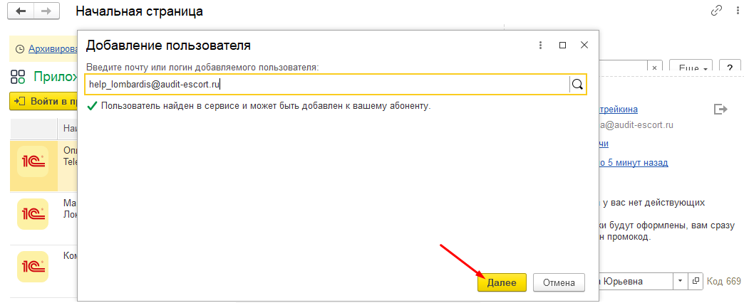 Если пользователь найден, то сервис напишет уведомление Пользователь найден в сервисе и может быть добавлен к вашему абоненту. Нажать Далее.