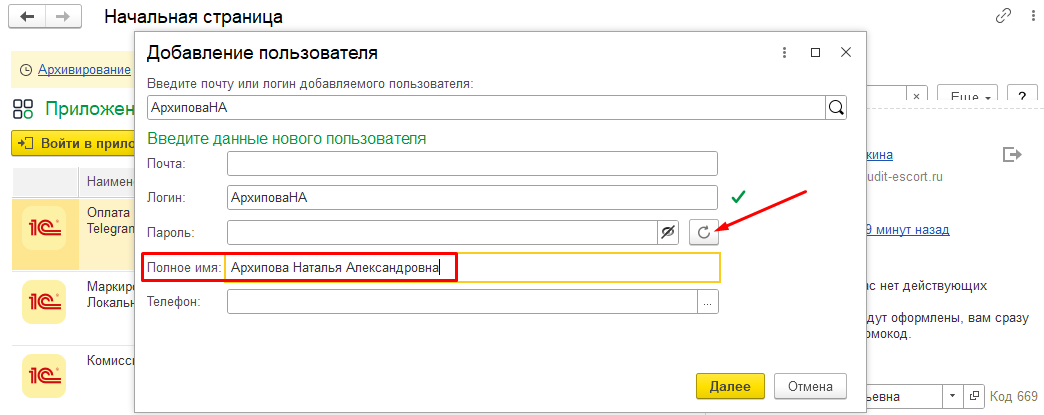 Для обычного товароведа достаточно ввести только ФИО и нажать на круглую стрелку для генерации пароля или пароль можно задать вручную.