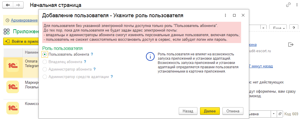 Администратор абонента (управление пользователями абонента) - права обычного пользователя, а также право добавлять пользователей, управлять доступом пользователей к приложениям Сервиса.
