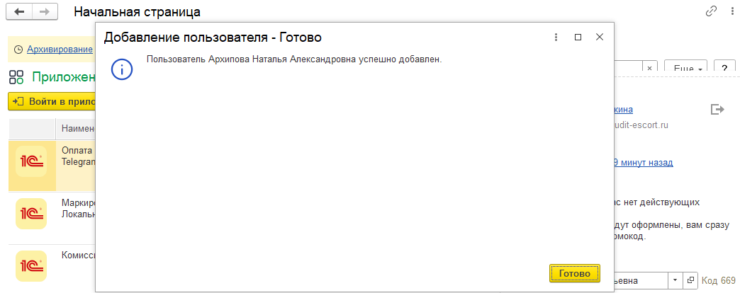 Пользователь успешно создан - Готово.