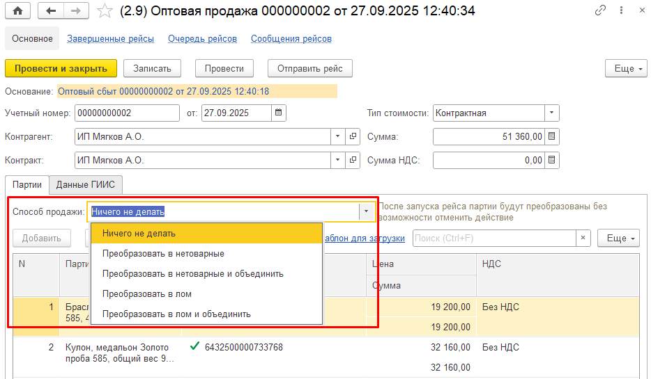 Рейс 2.9 Оптовая продажа - рейс полного цикла оптовой продажи от создания контракта и спецификации до преобразования и объединения партий.