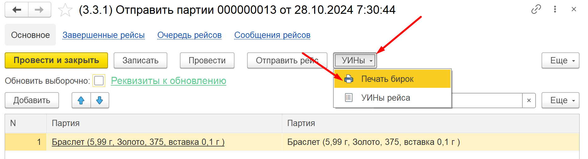 В рейсах можно открыть сам рейс, нажать на кнопку УИНы - Печать бирок.