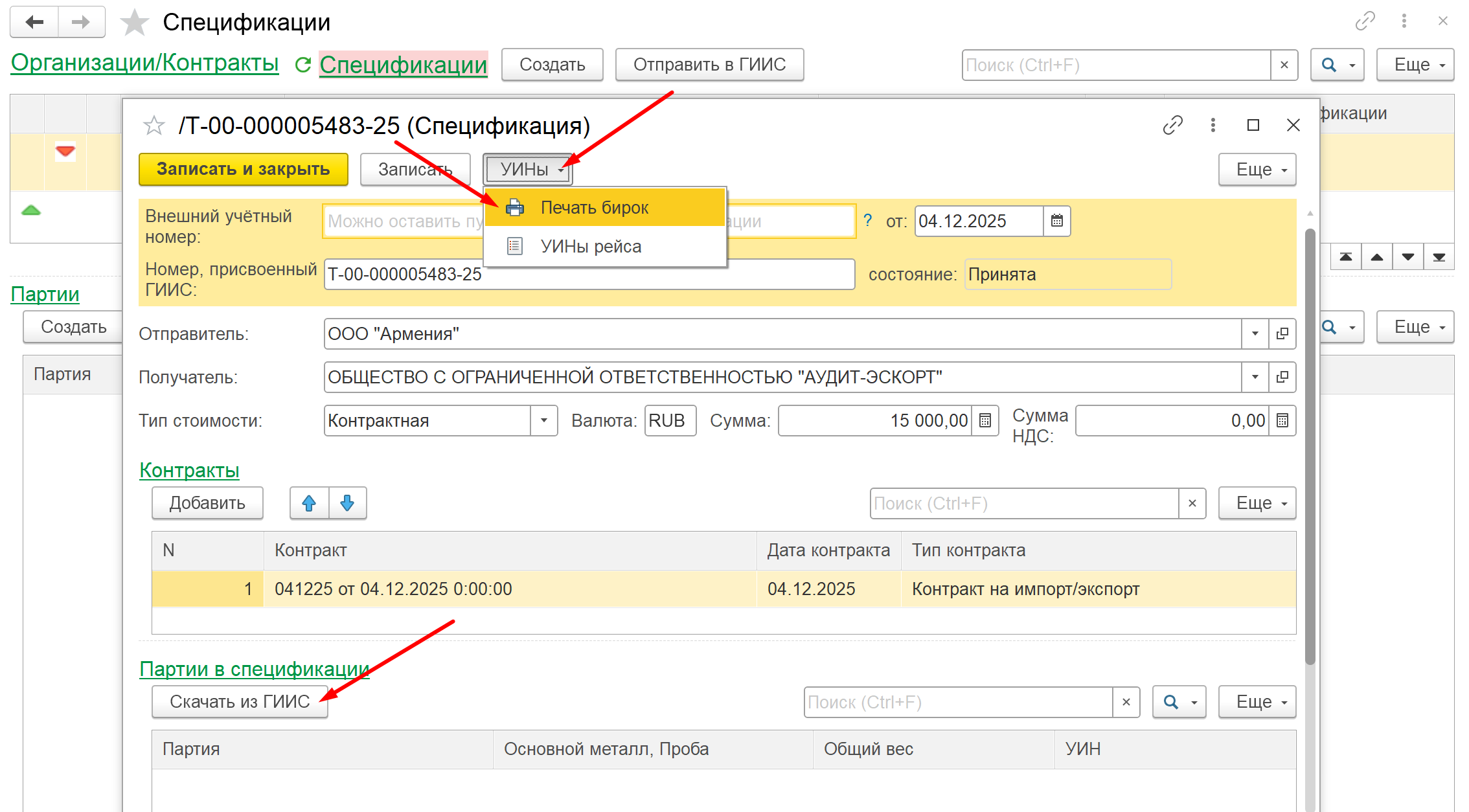 В разделе Спецификации, найти и открыть нужную спецификацию. По кнопке Скачать из ГИИС загрузить партии по спецификации и после сформирвоать бирки, нажать на кнопку УИНы - Печать бирок.