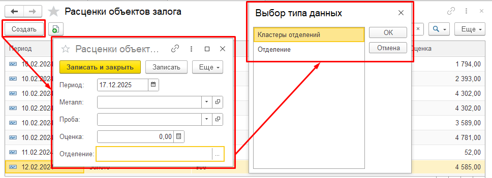 Далее это кластер можно использовать в расценках объектов залога для установки расценки не на одно отделение, а на кластер (группу) отделений.