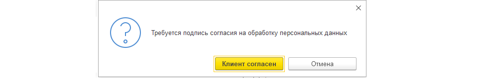 После заполнения формы добавления клиента и нажатия кнопки Записать и выдать займ, в случае, если с клиентом не было подписано соглашение об обработке персональных данных, сервис предложит его подписать. Про настройки подписания согласий на ПДн подробно тут.