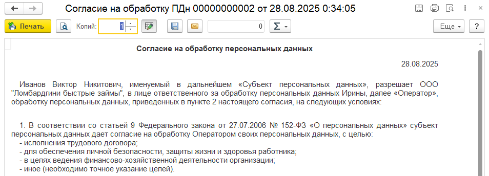 При согласии клиента подписать откроется печатная форма, форму необходимо распечатать и дать на подпись клиенту, только после подписи продолжить оформление займа.