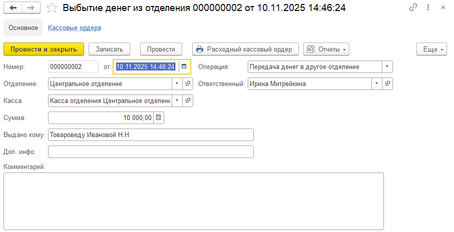 В открывшемся документе Выбытие денег из отделений (создание) большая часть реквизитов предзаполнены