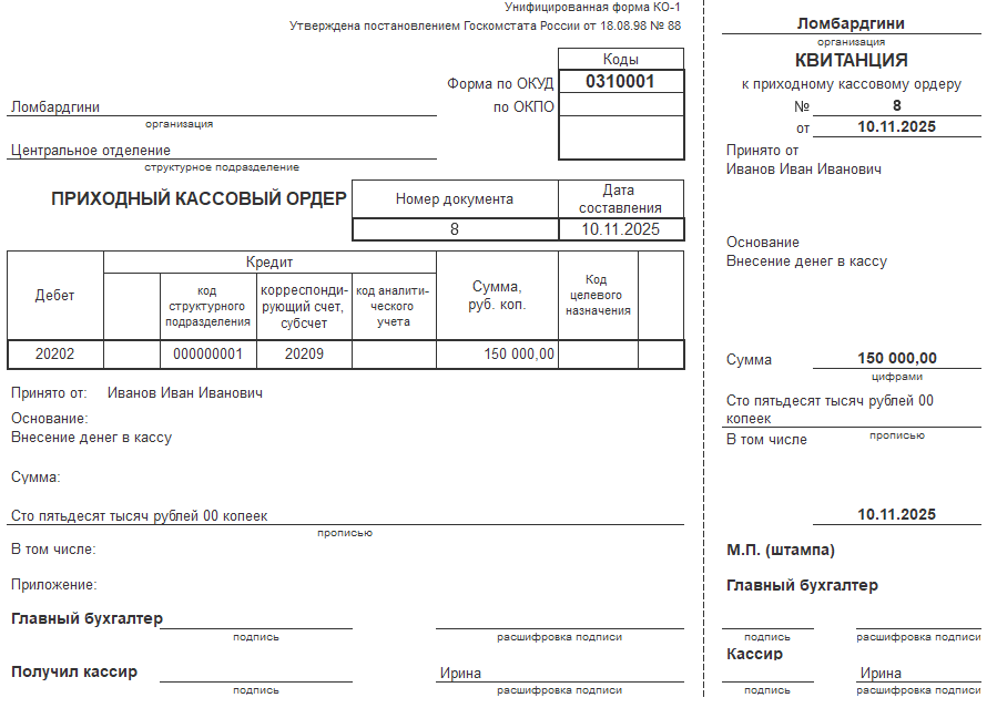 После проведения документа можно распечатать Приходный кассовый ордер по одноименной кнопке.