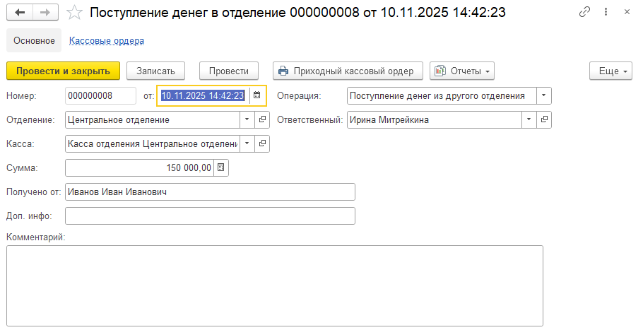 В открывшемся документе Поступление денег в отделение (создание) большая часть реквизитов предзаполнены