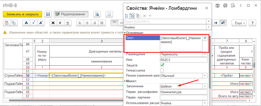 Для того, чтобы вывести номер залогового билета в печатную форму ИНВ-8, нужно в макете в поле наименование установить свойство на колонку Шаблон и внести туда [ЗалоговыйБилет] [Наименование].