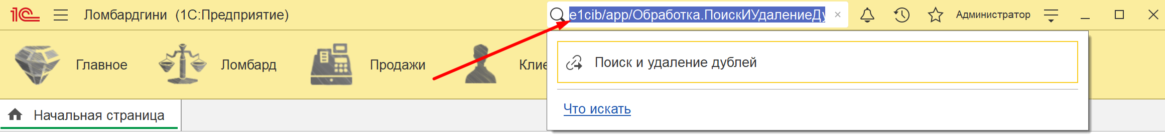 Чтобы воспользоваться обработкой, необходимо скопировать ссылку на обработку и вставить её в поисковую строку в Ломбардис и нажать на Поиск и удаление дублей.