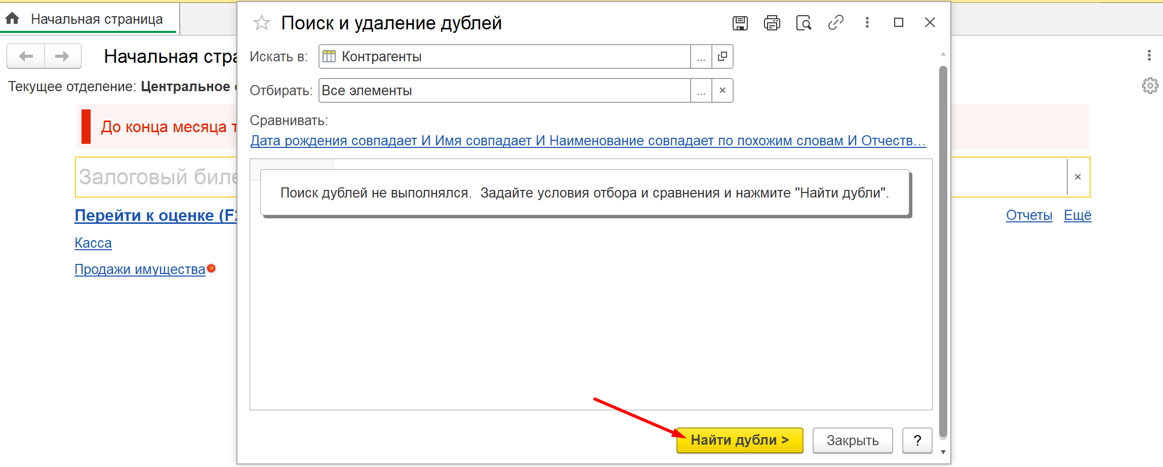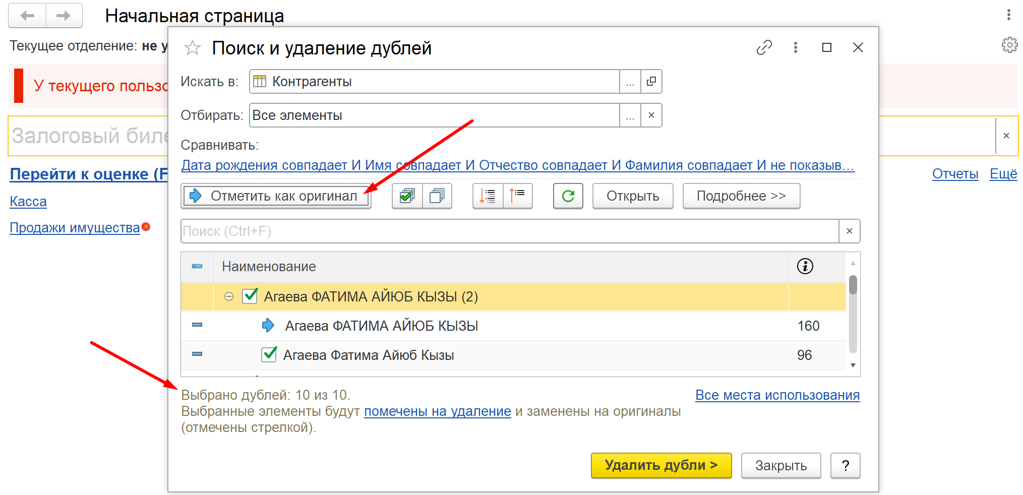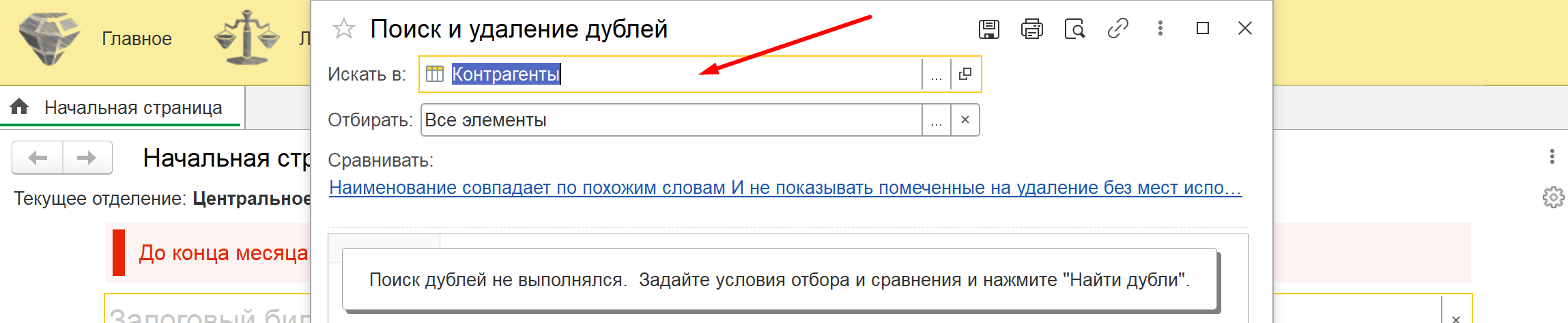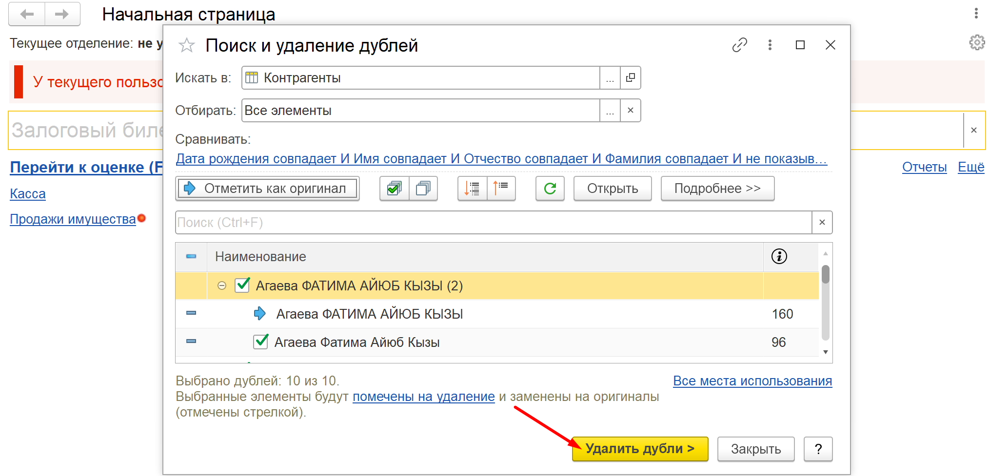 После удаления в Ломбардис нужно удалить дубли и в УМФО (там объектов в системе больше и удаляются дубли ещё дольше). Удаляются дубли в УМФО такой же обработкой Поиск и удаление дублей (можно найти через функции технического специалиста), только по двум справочникам, сразу по справочнику физические лица (отбор ФИО и дата рождения совпадает), а потом по справочнику контрагенты (отбор физическое лицо совпадает).