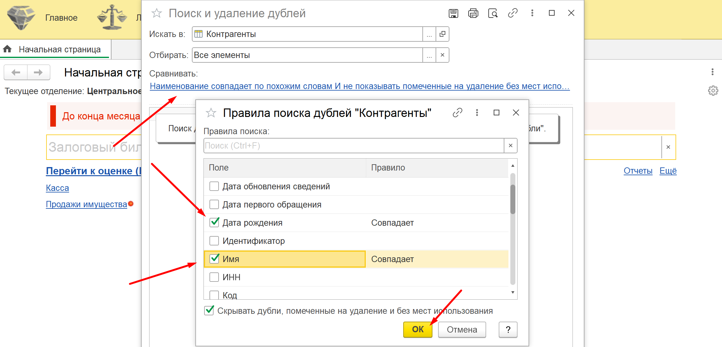 Дальше необходимо настроить параметры сравнения. Нажать на гиперссылку, откроется окно правил поиска дублей, установить флаги на фамилия, имя, отчество и дата рождения и нажать ОК.